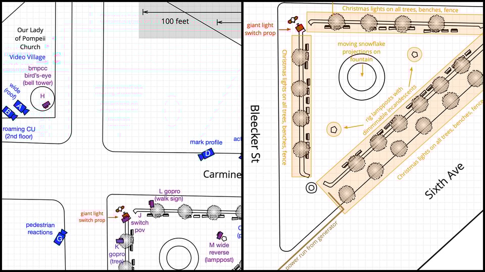 After scouting many NYC parks and plazas, we landed on the most charming spot in the West Village, Father Demo Square, named after Father Antonio Demo, who was the pastor of the nearby Our Lady of Pompeii church, where we rented space for holding, video village, and even rigged a spotlight in the steeple pointed down to illuminate the light switch.